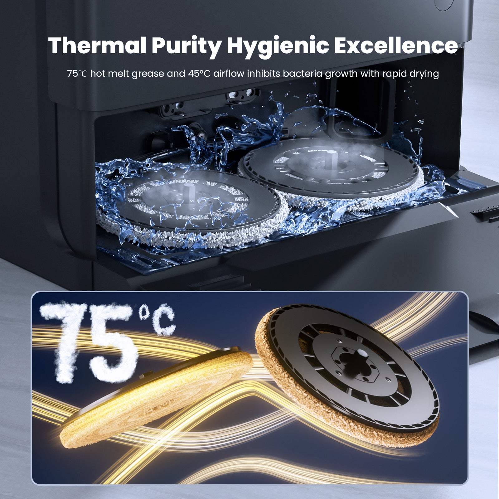 Integrates auto-emptying, refilling, and self-cleaning tech. With 167°F (75℃) washing, 113°F (45℃) hot air drying, and a 2.5L antibacterial dust bag, supporting 60 days of maintenance-free operation.